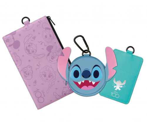 另一款「 Zip-Up Pouch 套裝」 包括有超萌大頭散紙包、 拉鏈包、 輕便卡片套及爬山扣, 超萌大頭散紙包以鋼牙與大鼻、史迪仔、勞蘇及三眼仔的頭型作剪裁,配襯印上由不同卡通人物拼圖設計的長形拉鏈包,以及迪士尼 100 周年特別版卡片套,每款卡片套均印有銀色卡通人物剪影和「 Disney100」標誌, 充滿了迪士尼角色元素之餘, 亦極具收藏價值!