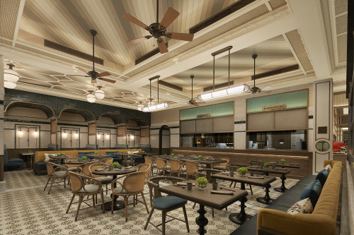 「喜公館」是以現代倫敦大都會的設計及生活模式為靈感,在同一屋簷下提供三種不同主題的餐飲體驗,全天候為賓客提供不同的餐飲選擇。包括了以英倫酒吧餐廳為靈感的「叁」,到提供各款即場製作的地道廣東美食的「餐」,以及為一眾甜品愛好者打造的「The Sweet Shop」,提供了一系列色彩繽紛且包裝精美的英式糖果、西餅及蛋糕等,非常適合送禮及慶祝特別的節日。三種不同主題的餐飲體驗和諧而緊密地結合,並以「茶室」為中心把各空間連繫起來,賓客可於此以外帶形式,品嚐到每天新鮮製作出不同的甜點及包餅。