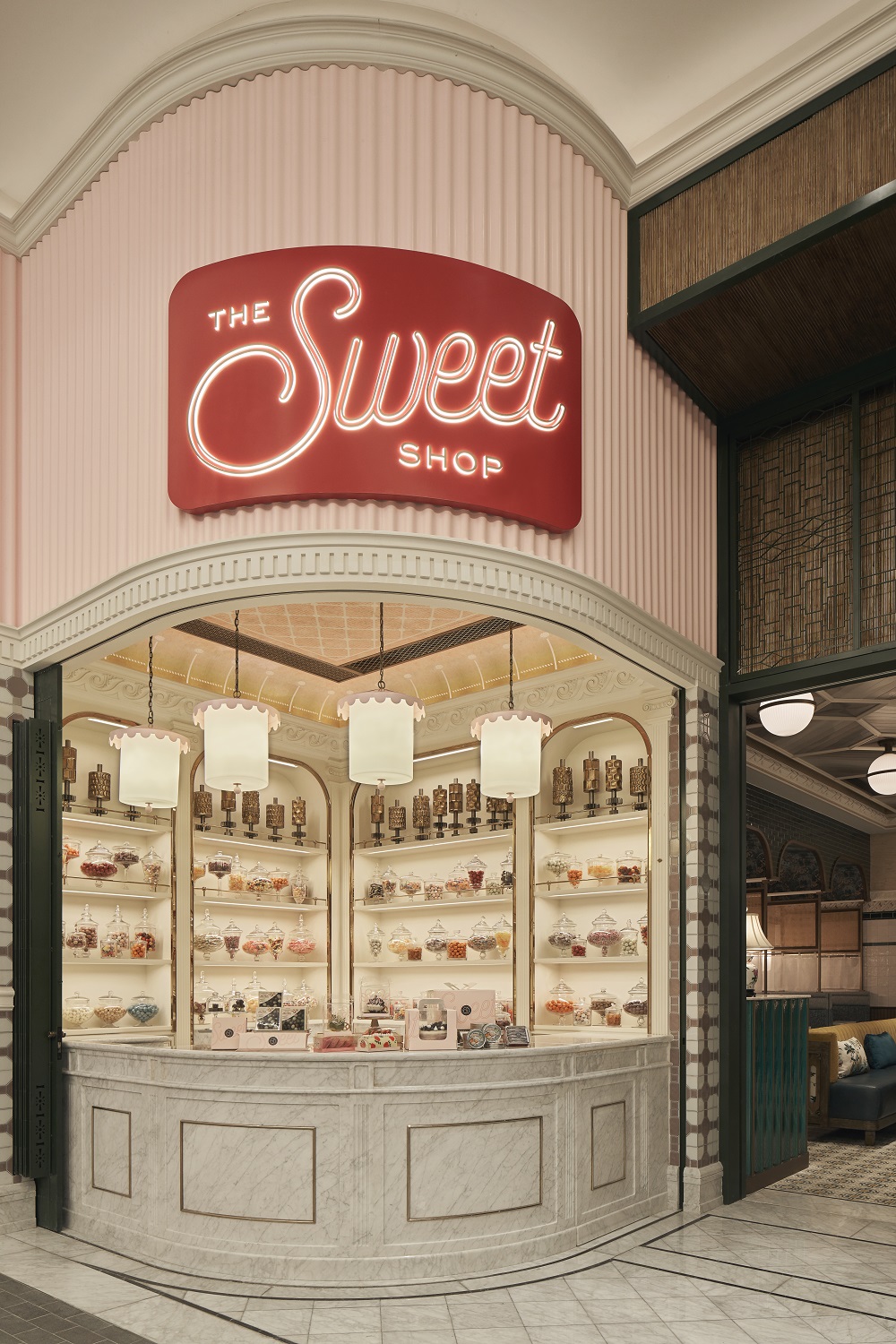 「The Sweet Shop」把英國街頭上傳統的糖果店帶到充滿英倫氣息的莎士比亞大廳內。店鋪以不同形狀的玻璃甕裝起一系列色彩繽紛的糖果為裝飾,打造出許多人心目中的童年夢想國度。除了提供一系列包裝精美的品牌糖果,更有不同風味的英式甜點供賓客堂食及外帶。店鋪外更設有懷舊雪糕車,全日為賓客提供不同口味的雪糕。