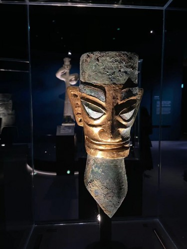 三星堆目前出土了多件戴金面罩青銅人頭,其中約一半為平頂人頭像,其腦後的髮辮以具地方民族風格的寬髮帶紮結。青銅上的金箔面罩或為王權集團中有特殊地位及權威者的象徵。