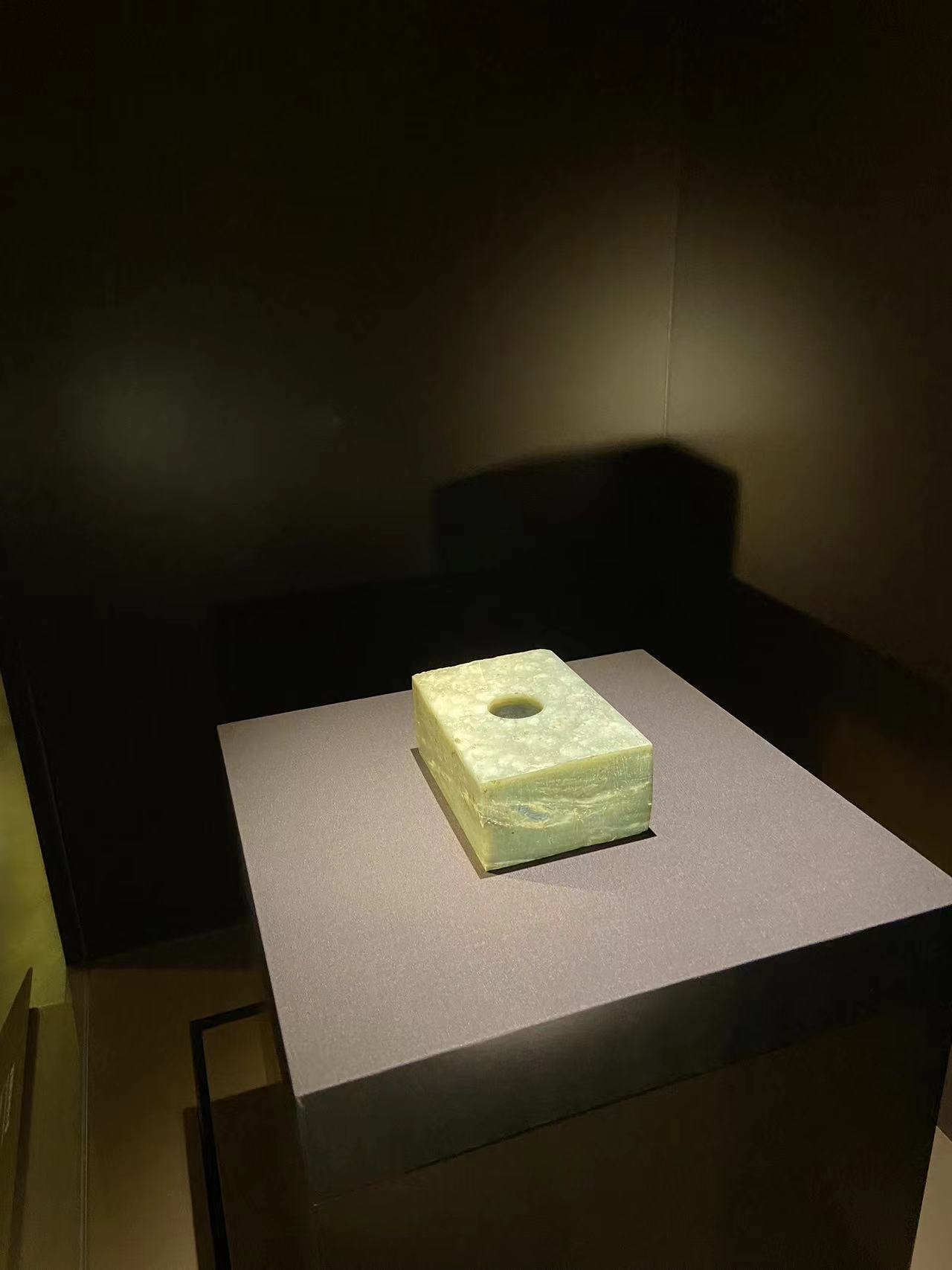 該玉器上端中央鑿有一個半穿的圓孔,推測是用於擺放插件的底座。前所未見的是,器身四面刻滿各種見於三星堆各類器物上的紋飾,相對兩側基本相同,一為獸面紋,一為鳳鳥和樹紋;四面還有共計八個蟬紋(亦有學者稱人面紋)。